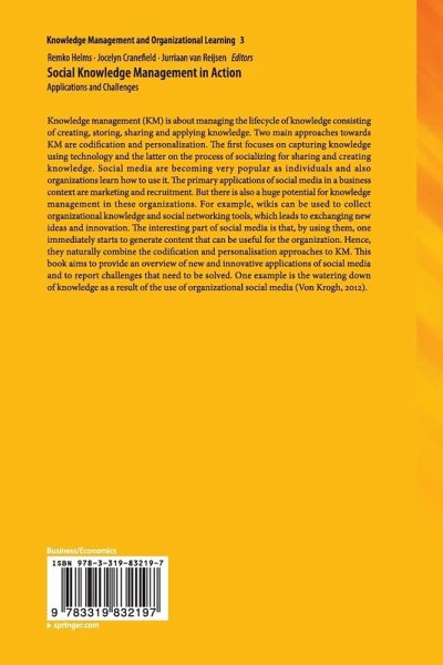 Knowledge management (KM) is about managing the lifecycle of knowledge consisting of creating, storing, sharing and applying knowledge. Two main approaches towards KM are codification and personalization. The first focuses on capturing knowledge using technology and the latter on the process of socializing for sharing and creating knowledge. Social media are becoming very popular as individuals and also organizations learn how to use it. The primary applications of social media in a business context are marketing and recruitment. But there is also a huge potential for knowledge management in these organizations. For example, wikis can be used to collect organizational knowledge and social networking tools, which leads to exchanging new ideas and innovation. The interesting part of social media is that, by using them, one immediately starts to generate content that can be useful for the organization. Hence, they naturally combine the codification and personalisation approaches to KM. This book aims to provide an overview of new and innovative applications of social media and to report challenges that need to be solved. One example is the watering down of knowledge as a result of the use of organizational social media (Von Krogh, 2012).