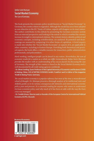 The book presents the economic policy model known as "Social Market Economy" in Germany, the country where it originated. Although the model has since been adopted as core objective in the EU Treaty of Lisbon, experts still disagree on its exact nature. The author contributes to this debate by presenting the German economic system from an external perspective and looking at the extent to which it enabled the country increase its weight in international relations. The system´s history, identity, political and economic concepts, including ordoliberalism, are analyzed. Its potential and shortcomings are assessed by comparing it to other forms of capitalism. A brief enquiry is made into whether the "Social Market Economy", or aspects of it, are applicable to other countries, including in Eastern Europe. Providing both theoretical and practical aspects, the book offers a valuable resource for researchers, public administration professionals, and policymakers.