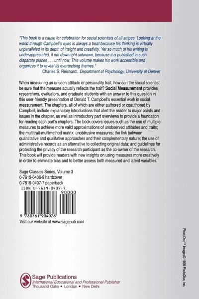 This book provides researchers, evaluators, and graduate students with a user-friendly presentation of CampbellÆs essential work (including his latest thoughts on some of his classic works) in social measurement. The book includes CampbellÆs arguments as to why qualitative approaches belong with quantitative ones as the assumptive background to relevant quantitative measures, his debate with deconstructionists and social constructionists on measurement validity, and an expansion and further explanation of his multitrait-multimethod matrix. By including overviews for each part and article as well as provide social scientists with useful insights into CampbellÆs papers in a format accessible to advanced undergraduate and graduate students.