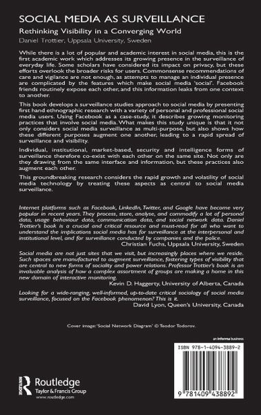 This book develops a surveillance studies approach to social media by presenting first hand ethnographic research with a variety of personal and professional social media users. Using Facebook as a case-study, it describes growing monitoring practices that involve social media. What makes this study unique is that it not only considers social media surveillance as multi-purpose, but also shows how these different purposes augment one another, leading to a rapid spread of surveillance and visibility.