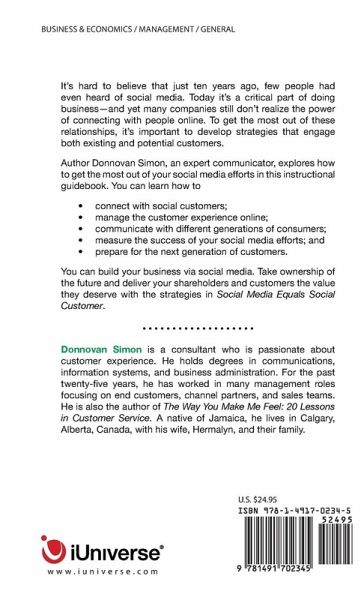 It's hard to believe that just ten years ago, few people had even heard of social media. Today it's a critical part of doing business-and yet many companies still don't realize the power of connecting with people online. To get the most out of these relationships, it's important to develop strategies that engage both existing and potential customers. Author Donnovan Simon, an expert communicator, explores how to get the most out of your social media efforts in this instructional guidebook. You can learn how to ¿ connect with social customers; ¿ manage the customer experience online; ¿ communicate with different generations of consumers; ¿ measure the success of your social media efforts; and ¿ prepare for the next generation of customers. You can build your business via social media. Take ownership of the future and deliver your shareholders and customers the value they deserve with the strategies in Social Media Equals Social Customer.
