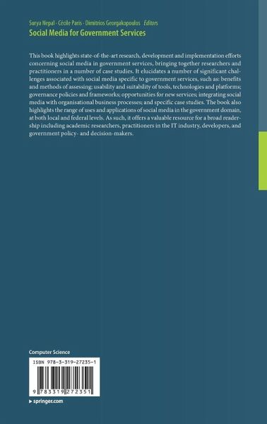 This book highlightsstate-of-the-art research, development and implementation efforts concerningsocial media in government services, bringing together researchers andpractitioners in a number of case studies. It elucidates a number ofsignificant challenges associated with social media specific to governmentservices, such as: benefits and methods of assessing; usability andsuitability of tools, technologies and platforms; governance policies andframeworks; opportunities for new services; integrating social media with organisationalbusiness processes; and specific case studies. The book also highlights therange of uses and applications of social media in the government domain, atboth local and federal levels. As such, it offers a valuable resource for abroad readership including academic researchers,practitioners in the IT industry, developers, and government policy- anddecision-makers.