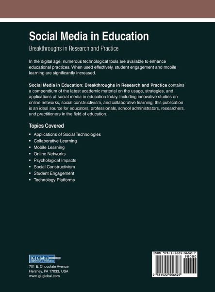 In the digital age, numerous technological tools are available to enhance educational practices. When used effectively, student engagement and mobile learning are significantly increased. Social Media in Education: Breakthroughs in Research and Practice contains a compendium of the latest academic material on the usage, strategies, and applications of social media in education today. Including innovative studies on online networks, social constructivism, and collaborative learning, this publication is an ideal source for educators, professionals, school administrators, researchers, and practitioners in the field of education.