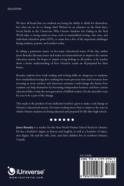 We have all heard that our students are losing the ability to think for themselves, but what can we do to change that? Written by an educator on the front lines, Social Media in the Classroom: Why Ontario Students Are Failing in the Real World takes a strong stand on issues such as standardized testing, class sizes, and individual education plans (IEPs), to name but a few of the important challenges facing students, parents, and teachers today. In taking a passionate stance on hot-topic educational issues of the day, author Jason Beaudry discusses issues and makes recommendations to improve the current education system. He hopes to inspire strong feelings in all readers, as he teaches them a better understanding of how Ontario's youth are ill-prepared for their future. Beaudry explores how weak reading and writing skills are dangerous to students; how standardized testing does nothing but waste precious time and resources; how investing in more teachers and classroom assistants could change the future; how students can help themselves by becoming independent learners; and how current education fails to train the next generation of skilled workers. He also describes ways for you to be a part of the change. This study is the product of one dedicated teacher's quest to make a real change in Ontario's educational system. He wants nothing more than to improve the ways in which Ontario students are being educated and prepared for life after high school.