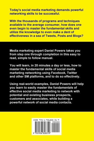 Today's social media marketing demands powerful networking skills to be successful. With the thousands of programs and techniques available to the average consumer, how does one even begin to master the fundamental skills and utilize the knowledge to even make a dent of effectiveness in a sea of Tweets, Posts and Blogs? Media marketing expert Daniel Powers takes you from step one through completion in this easy to read, simple to follow manual. You will learn, in 20 minutes a day or less, how to master the fundamental skills of social media marketing networking using Facebook, Twitter and other SM platforms, and to do so effectively. Using real-world examples, Daniel Powers will help you learn to easily master the fundamentals of effective social media marketing to network with potential and existing business prospects, customers and associates, while building a powerful network of social media contacts.