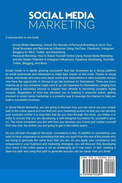 If you want to discover how to grow your small business and personal brand using social media, then keep reading... Two manuscripts in one book: Social Media Marketing: Unlock the Secrets of Personal Branding to Grow Your Small Business and Become an Influencer Using YouTube, Facebook, Instagram, Blogging for SEO, Twitter, and Advertising Personal Branding: How to Brand Yourself Online Using Social Media Marketing and the Hidden Potential of Instagram Influencers, Facebook Advertising, YouTube, Twitter, Blogging, and More Social media is a rapidly growing ecosystem that has developed as a strong platform for small businesses and influencers to make their impact on the world. Regardless of what has attracted you to building a presence online, getting involved in social media marketing is a powerful way to leverage the internet to help you build a successful business. If you are ready to identify your vision, carve out your unique brand, and market yourself online so that you can earn an additional side income or become a full-blown digital nomad, now is the time! This book was written from an entrepreneur, with the guidance and support of many other successful entrepreneurs who are each leveraging social media for maximum growth. So discover the secrets you need to know to succeed using social media today! Some of the topics covered in part 1 of this book include: Creating your vision Identifying your brand persona Facebook marketing Instagram marketing Twitter marketing YouTube marketing Blogging for SEO Advertising And more! The book will of course cover the specifics you need such as: How to make YouTube videos, blog posts, and social media content that converts How you can use sales funnels and contests to maximize your follower count The skinny on Facebook and Instagram advertisements and how to make them actually convert The many ways that you can make money with a blog And much more! Some of the topics covered in part 2 of this book include: The Personal Reality of Personal Branding Clarifying Your Brand Online and Local Influencers Facebook and Instagram Twitter Marketing YouTube and Podcasts Blogging and Bloggers And more! So if you want to learn more about social media marketing and personal branding, then scroll up and click "add to cart"!