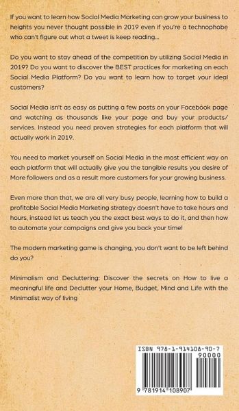 If you want to learn how Social Media Marketing can grow your business to heights you never thought possible then keep reading... Do you want to stay ahead of the competition by utilizing Social Media in 2019? Do you want to discover the BEST practices for marketing on each Social Media Platform? Do you want to learn how to target your ideal customers? Social Media isn’t as easy as putting a few posts on your Facebook page and watching as thousands like your page and buy your products/ services. Instead you need proven strategies for each platform that will actually work in 2019. You need to market yourself on Social Media in the most efficient way on each platform that will actually give you the tangible results you desire of More followers and as a result more customers for your growing business. Even more than that, we are all very busy people, learning how to build a profitable Social Media Marketing strategy doesn’t have to take hours and hours, instead let us teach you the exact best ways to do it, and then how to automate your campaigns and give you back your time! The modern marketing game is changing, you don’t want to be left behind do you? Don’t just take my word for it, actual studies are proving how the game is switching to Social Media. For starters almost 3 billion people are signed up to Social Media with over 1 million new users every single day. Here is just a slither of what you will discover inside... • The 5 MUST KNOW Social Media Marketing strategies for 2019! o How to make more money by spending less on Ads o Stop wasting time posting to a pointless Facebook page, do this instead! o The most Optimal times to post on Facebook and how to automate your posting around this o What 7 Figure online businesses WON’T tell you about Facebook Ads o Why more businesses are turning to Social Media than ever before! o How unemployed teenagers are getting rich with Facebook ads o 7 Tips for instantly rejuvenating your Twitter Marketing o Exactly how to gain THOUSANDS of followers on Instagram o 20 Essential Facebook Marketing secrets to take your campaigns to the next level o How to gain over 4423 followers per month and beyond on Instagram with proper marketing campaigns o A simple, yet powerful technique used by YouTubers with millions of subscribers for growing your following o A 7 step guide to your brand dominating on Facebook in 2019 and beyond o The secrets to engaging with your audience that leads to more conversions than ever before o 10 Practical tips that can be implemented right away for EVERY Social Media platform you need to be on! And, much much more! Even if you’ve never written out a Facebook status or posted a picture on Instagram before this book will still show you exactly how you can use Social Media to grow your brand and business to levels you never believed possible! Furthermore, Social Media Marketing is ALWAYS changing, what you need is up to date guides and tips that will actually be effective in 2019 (and beyond!) and this book provides exactly that. Don’t be left behind while your competitors thrive. So, if you want to learn how to grow your Social Media following and take your business to the next level click "Add to Cart" at the top of this page.