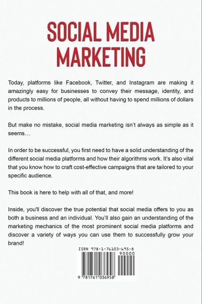 SOCIAL MEDIA MARKETING Today, platforms like Facebook, Twitter, and Instagram are making it amazingly easy for businesses to convey their message, identity, and products to millions of people, all without having to spend millions of dollars in the process. But make no mistake, social media marketing isn't always as simple as it seems... In order to be successful, you first need to have a solid understanding of the different social media platforms and how their algorithms work. It's also vital that you know how to craft cost-effective campaigns that are tailored to your specific audience. This book is here to help with all of that, and more! Inside, you'll discover the true potential that social media offers to you as both a business and an individual. You'll also gain an understanding of the marketing mechanics of the most prominent social media platforms and discover a variety of ways you can use them to successfully grow your brand! ¿