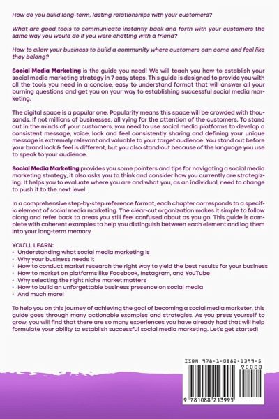 How do you build long-term, lasting relationships with your customers? What are good tools to communicate instantly back and forth with your customers the same way you would do if you were chatting with a friend? How to allow your business to build a community where customers can come and feel like they belong? Social Media Marketing is the guide you need! We will teach you how to establish your social media marketing strategy in 7 easy steps. This guide is designed to provide you with all the tools you need in a concise, easy to understand format that will answer all your burning questions and get you on your way to establishing successful social media marketing. The digital space is a popular one. Popularity means this space will be crowded with thousands, if not millions of businesses, all vying for the attention of the customers. To stand out in the minds of your customers, you need to use social media platforms to develop a consistent message, voice, look and feel consistently sharing and defining your unique message is extremely relevant and valuable to your target audience. You stand out before your brand look & feel is different, but you also stand out because of the language you use to speak to your audience. Social Media Marketing provides you some pointers and tips for navigating a social media marketing strategy, it also asks you to think and consider how you currently are strategizing. It helps you to evaluate where you are and what you, as an individual, need to change to push it to the next level. In a comprehensive step-by-step reference format, each chapter corresponds to a specific element of social media marketing. The clear-cut organization makes it simple to follow along and refer back to areas you still feel confused about as you go. This guide is complete with coherent examples to help you distinguish between each element and log them into your long-term memory. YOU'LL LEARN:Understanding what social media marketing is Why your business needs it How to conduct market research the right way to yield the best results for your business How to market on platforms like Facebook, Instagram, and YouTube Why selecting the right niche market matters How to build an unforgettable business presence on social media And much more! To help you on this journey of achieving the goal of becoming a social media marketer, this guide goes through many actionable examples and strategies. As you press yourself to grow, you will find that there are so many experiences you have already had that will help formulate your ability to establish successful social media marketing. Let's get started!