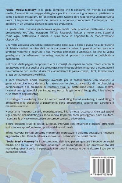 "Social Media Mastery" è la guida completa che ti condurrà nel mondo dei social media, fornendoti una mappa dettagliata per il successo e il guadagno su piattaforme come YouTube, Instagram, TikTok e molte altre. Questo libro rappresenta un'opportunità unica di imparare da esperti del settore e acquisire competenze fondamentali per eccellere in un universo digitale in continua evoluzione. La guida inizia con una panoramica approfondita delle principali piattaforme social, presentando YouTube, Instagram, TikTok, Facebook, Twitter e molto altro. Scoprirai come ogni piattaforma funziona e quali sono le opportunità di monetizzazione disponibili. Una volta acquisita una solida comprensione delle basi, il libro ti guida nella definizione di obiettivi realistici e misurabili per la tua presenza online. Imparerai come creare una strategia vincente e costruire il tuo marchio personale o aziendale, sia che tu voglia guadagnare da influencer marketing, vendita di prodotti o servizi, o pubblicità a pagamento. Nel corso delle pagine, scoprirai trucchi e consigli da esperti su come creare contenuti accattivanti e di alta qualità che coinvolgeranno il tuo pubblico. Imparerai a ottimizzare il tuo contenuto per i motori di ricerca e ad utilizzare le parole chiave, i titoli, le descrizioni e i tag per aumentare la visibilità. Il libro affronterà anche strategie avanzate per la collaborazione con sponsor, la generazione di entrate durante le trasmissioni in diretta, la vendita di merchandising personalizzato e la creazione di contenuti virali su piattaforme come TikTok. Inoltre, riceverai consigli specifici per Instagram, tra cui la gestione di fotografie, il branding e l'uso efficace degli hashtag. Le strategie di marketing, tra cui il content marketing, l'email marketing, il marketing di affiliazione e la pubblicità a pagamento, sono ampiamente coperte per garantire il massimo successo. Nonostante l'importanza della monetizzazione, il libro mette l'accento anche sugli aspetti legali ed etici del marketing sui social media. Imparerai come proteggere i diritti d'autore, rispettare la privacy e mantenere un comportamento etico online. Il libro presenta studi di casi di successo, interviste con influencer e esperti, offrendoti ispirazione e approfondimenti preziosi dal mondo reale. Infine, riceverai consigli su come monitorare le prestazioni della tua strategia e rimanere aggiornato sulle ultime tendenze e innovazioni nel mondo dei social media. "Social Media Mastery" è il tuo compagno definitivo per conquistare il mondo dei social media. Che tu sia un aspirante influencer, un imprenditore o un professionista del marketing, questa guida ti equipaggia con tutto il necessario per realizzare il tuo pieno potenziale online.