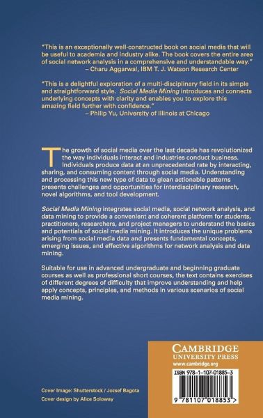 The growth of social media over the last decade has revolutionized the way individuals interact and industries conduct business. Individuals produce data at an unprecedented rate by interacting, sharing, and consuming content through social media. Understanding and processing this new type of data to glean actionable patterns presents challenges and opportunities for interdisciplinary research, novel algorithms and tool development. Social Media Mining integrates social media, social network analysis, and data mining to provide a coherent platform to understand the basics and potentials of social media mining. It introduces the unique problems arising from social media data and presents fundamental concepts, emerging issues, and effective algorithms for network analysis and data mining. Suitable for use in advanced undergraduate and beginning graduate courses as well as professional short courses, the text contains exercises of different degrees of difficulty that improve understanding and help apply concepts, principles and methods for social media mining.