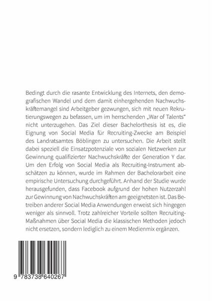 Bedingt durch die rasante Entwicklung des Internets, den demografischen Wandel und dem damit einhergehenden Nachwuchskräftemangel sind Arbeitgeber gezwungen, sich mit neuen Rekrutierungswegen zu befassen, um im herrschenden "War of Talents" nicht unterzugehen. Das Ziel dieser Bachelorthesis ist es, die Eignung von Social Media für Recruiting-Zwecke am Beispiel des Landratsamtes Böblingen zu untersuchen. Die Arbeit stellt dabei speziell die Einsatzpotenziale von sozialen Netzwerken zur Gewinnung qualifizierter Nachwuchskräfte der Generation Y dar. Um den Erfolg von Social Media als Recruiting-Instrument abschätzen zu können, wurde im Rahmen der Bachelorarbeit eine empirische Untersuchung durchgeführt. Anhand der Studie wurde herausgefunden, dass Facebook aufgrund der hohen Nutzerzahl zur Gewinnung von Nachwuchskräften am geeignetsten ist. Das Betreiben anderer Social Media Anwendungen erweist sich hingegen weniger als sinnvoll. Trotz zahlreicher Vorteile sollten Recruiting-Maßnahmen über Social Media die klassischen Methoden jedoch nicht ersetzen, sondern lediglich zu einem Medienmix ergänzen.