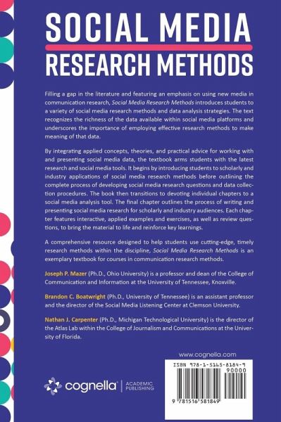 Filling a gap in the literature and featuring an emphasis on using new media in communication research, Social Media Research Methods introduces students to a variety of social media research methods and data analysis strategies. The text recognizes the richness of the data available within social media platforms and underscores the importance of employing effective research methods to make meaning of that data. By integrating applied concepts, theories, and practical advice for working with and presenting social media data, the textbook arms students with the latest research and social media tools. It begins by introducing students to scholarly and industry applications of social media research methods before outlining the complete process of developing social media research questions and data collection procedures. The book then transitions to devoting individual chapters to a social media analysis tool. The final chapter outlines the process of writing and presenting social media research for scholarly and industry audiences. Each chapter features interactive, applied examples and exercises, as well as review questions, to bring the material to life and reinforce key learnings. A comprehensive resource designed to help students use cutting-edge, timely research methods within the discipline, Social Media Research Methods is an exemplary textbook for courses in communication research methods.