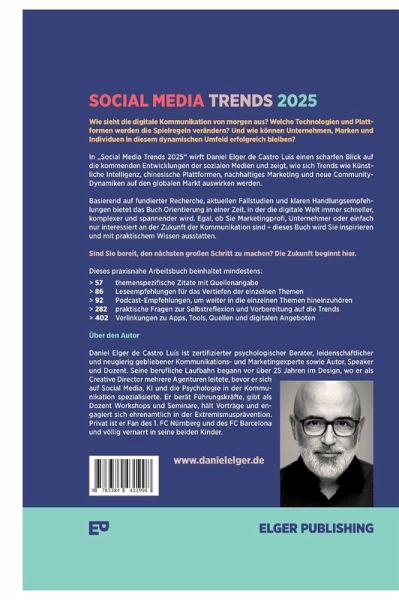 Wie sieht die digitale Kommunikation von morgen aus? Welche Technologien und Plattformen werden die Spielregeln verändern? Und wie können Unternehmen, Marken und Individuen in diesem dynamischen Umfeld erfolgreich bleiben?In "Social Media Trends 2025" wirft Daniel Elger de Castro Luis einen scharfen Blick auf die kommenden Entwicklungen der sozialen Medien und zeigt, wie sich Trends wie Künstliche Intelligenz, chinesische Plattformen, nachhaltiges Marketing und neue Community-Dynamiken auf den globalen Markt auswirken werden.Basierend auf fundierter Recherche, aktuellen Fallstudien und klaren Handlungsempfehlungen bietet das Buch Orientierung in einer Zeit, in der die digitale Welt immer schneller, komplexer und spannender wird. Egal, ob Sie Marketingprofi, Unternehmer oder einfach nur interessiert an der Zukunft der Kommunikation sind - dieses Buch wird Sie inspirieren und mit praktischem Wissen ausstatten. Zu den Trends im Buch gehören untera anderem:> Der Einfluss und die Nutzung künstlicher Intelligenz (KI / AI) und Social Media> Augemented und Virtual Reality> Social Media Sucht> Community Management> Social Commerce> Der Einfluss Chinas auf die weltweite Social Media Kommunikation> Neue und spannende Social Media KanäleSind Sie bereit, den nächsten großen Schritt zu machen? Die Zukunft beginnt hier.Dieses praxisnahe Arbeitsbuch beinhaltet mindestens:> 57 themenspezifische Zitate mit Quellenangabe> 86 Leseempfehlungen für das Vertiefen der einzelnen Themen> 92 Podcast-Empfehlungen, um weiter in die einzelnen Themen hineinzuhören> 282 praktische Fragen zur Selbstreflexion und Vorbereitung auf die Trends> 402 Verlinkungen zu Apps, Tools, Quellen und digitalen Angeboten