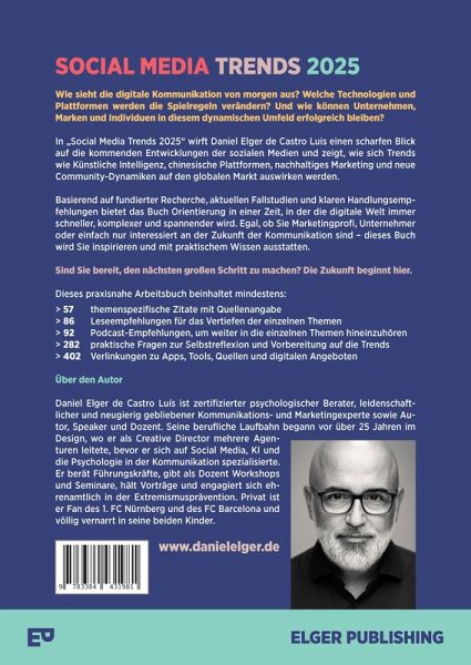Wie sieht die digitale Kommunikation von morgen aus? Welche Technologien und Plattformen werden die Spielregeln verändern? Und wie können Unternehmen, Marken und Individuen in diesem dynamischen Umfeld erfolgreich bleiben?In "Social Media Trends 2025" wirft Daniel Elger de Castro Luis einen scharfen Blick auf die kommenden Entwicklungen der sozialen Medien und zeigt, wie sich Trends wie Künstliche Intelligenz, chinesische Plattformen, nachhaltiges Marketing und neue Community-Dynamiken auf den globalen Markt auswirken werden.Basierend auf fundierter Recherche, aktuellen Fallstudien und klaren Handlungsempfehlungen bietet das Buch Orientierung in einer Zeit, in der die digitale Welt immer schneller, komplexer und spannender wird. Egal, ob Sie Marketingprofi, Unternehmer oder einfach nur interessiert an der Zukunft der Kommunikation sind - dieses Buch wird Sie inspirieren und mit praktischem Wissen ausstatten. Zu den Trends im Buch gehören untera anderem:> Der Einfluss und die Nutzung künstlicher Intelligenz (KI / AI) und Social Media> Augemented und Virtual Reality> Social Media Sucht> Community Management> Social Commerce> Der Einfluss Chinas auf die weltweite Social Media Kommunikation> Neue und spannende Social Media KanäleSind Sie bereit, den nächsten großen Schritt zu machen? Die Zukunft beginnt hier.Dieses praxisnahe Arbeitsbuch beinhaltet mindestens:> 57 themenspezifische Zitate mit Quellenangabe> 86 Leseempfehlungen für das Vertiefen der einzelnen Themen> 92 Podcast-Empfehlungen, um weiter in die einzelnen Themen hineinzuhören> 282 praktische Fragen zur Selbstreflexion und Vorbereitung auf die Trends> 402 Verlinkungen zu Apps, Tools, Quellen und digitalen Angeboten