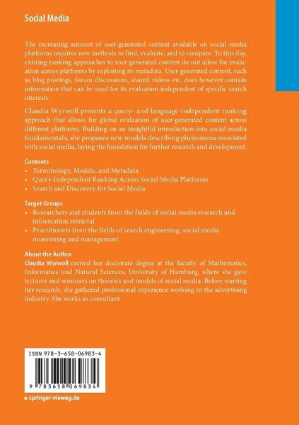 The increasing amount of user-generated content available on social media platforms requires new methods to find, evaluate, and to compare. To this day, existing ranking approaches to user-generated content do not allow for evaluation across platforms by exploiting its metadata. User-generated content, such as blog postings, forum discussions, shared videos etc. does however contain information that can be used for its evaluation independent of specific search interests. Claudia Wyrwoll presents a query- and language-independent ranking approach that allows for global evaluation of user-generated content across different platforms. Building on an insightful introduction into social media fundamentals, she proposes new models describing phenomena associated with social media, laying the foundation for further research and development.