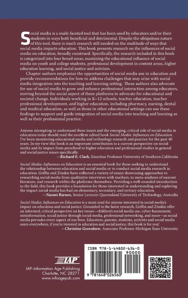 Social media is a multi-faceted tool that has been used by educators and/or their students in ways both beneficial and detrimental. Despite the ubiquitous nature of this tool, there is much research still needed on the multitude of ways that social media impacts education. This book presents research on the influences of social media on education, broadly construed. Specifically, the research included in this book is categorized into four broad areas, examining the educational influence of social media on youth and college students, professional development in content areas, higher education learning, and social justice and activism. Chapter authors emphasize the opportunities of social media use in education and provide recommendations for how to address challenges that may arise with social media integration into the teaching and learning setting. These authors also advocate for use of social media to grow and enhance professional interaction among educators, moving beyond the social aspect of these platforms to advocate for educational and societal change. Individuals working in K-12 schools, teacher education, teacher professional development, and higher education, including pharmacy, nursing, dental and medical education, as well as those in other educational settings can use these findings to support and guide integration of social media into teaching and learning as well as their professional practice.