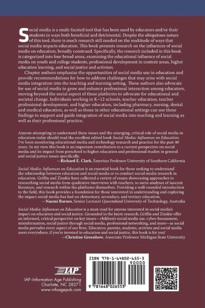 Social media is a multi-faceted tool that has been used by educators and/or their students in ways both beneficial and detrimental. Despite the ubiquitous nature of this tool, there is much research still needed on the multitude of ways that social media impacts education. This book presents research on the influences of social media on education, broadly construed. Specifically, the research included in this book is categorized into four broad areas, examining the educational influence of social media on youth and college students, professional development in content areas, higher education learning, and social justice and activism. Chapter authors emphasize the opportunities of social media use in education and provide recommendations for how to address challenges that may arise with social media integration into the teaching and learning setting. These authors also advocate for use of social media to grow and enhance professional interaction among educators, moving beyond the social aspect of these platforms to advocate for educational and societal change. Individuals working in K-12 schools, teacher education, teacher professional development, and higher education, including pharmacy, nursing, dental and medical education, as well as those in other educational settings can use these findings to support and guide integration of social media into teaching and learning as well as their professional practice.