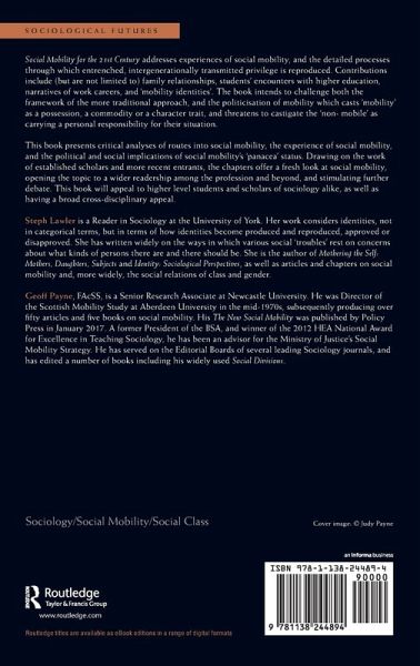 Steph Lawler is a Reader in Sociology at the University of York. Her work considers identities, not in categorical terms, but in terms of how identities become produced and reproduced, approved or disapproved. She has written widely on the ways in which various social 'troubles' rest on concerns about what kinds of persons there are and there should be. She is the author of Mothering the Self: Mothers, Daughters, Subjects and Identity: Sociological Perspectives, as well as articles and chapters on social mobility and, more widely, the social relations of class and gender. Geoff Payne, FAcSS, is a Senior Research Associate at Newcastle University. He was Director of the Scottish Mobility Study at Aberdeen University in the mid-1970s, subsequently producing over fifty articles and five books on social mobility. His The New Social Mobility was published by Policy Press in January 2017. A former President of the BSA, and winner of the 2012 HEA National Award for Excellence in Teaching Sociology, he has been an advisor for the Ministry of Justice's Social Mobility Strategy. He has served on the Editorial Boards of several leading Sociology journals, and has edited a number of books including his widely used Social Divisions.