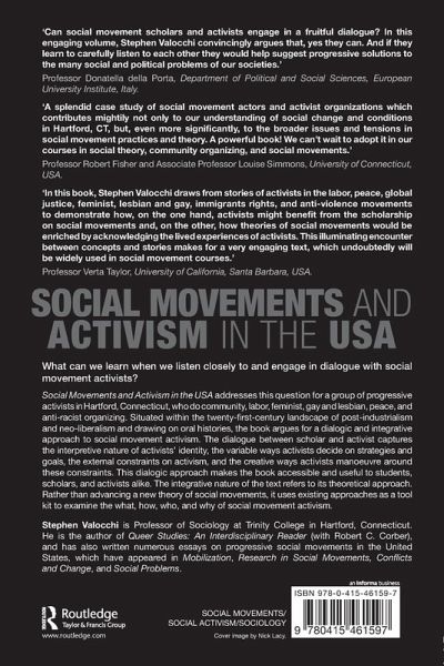What can we learn when we listen closely to and engage in dialogue with social movement activists? Social Movements and Activism in the USA addresses this question for a group of progressive activists in Hartford, Connecticut, who do community, labor, feminist, gay and lesbian, peace, and anti-racist organizing. Situated within the twenty-first-century landscape of post-industrialism and neo-liberalism and drawing on oral histories, the book argues for a dialogic and integrative approach to social movement activism. The dialogue between scholar and activist captures the interpretive nature of activists' identity, the variable ways activists decide on strategies and goals, the external constraints on activism, and the creative ways activists manoeuvre around these constraints. This dialogic approach makes the book accessible and useful to students, scholars, and activists alike. The integrative nature of the text refers to its theoretical approach. Rather than advancing a new theory of social movements, it uses existing approaches as a tool kit to examine the what, how, who, and why of social movement activism.