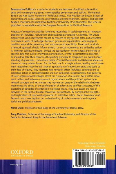 For the first time in a single volume, leading social movement researchers map the full range of applications of network concepts and tools to their field of inquiry. They illustrate how networks affect individual contributions to collective action in both democratic and non-democratic organizations; how patterns of inter-organizational linkages affect the circulation of resources both within movement milieus and between movement organizations and the political system; how network concepts and techniques may improve our grasp of the relationship between movements and elites, of the configuration of alliance and conflict structures, of the clustering of episodes of contention in protest cycles.Social Movements and Networks casts new light on our understanding of social movements and cognate social and political processes.