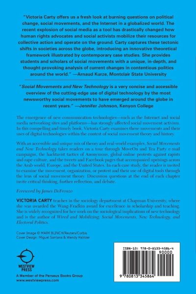 The emergence of new communication technologies (such as the Internet and social media networking sites and platforms) has strongly affected social movement activism. In this compelling and timely book, Victoria Carty examines these movements and their uses of digital technologies within the context of social movement theory and history. With an accessible and unique mix of theory and real-world examples, Social Movements and New Technology takes readers on a tour through MoveOn and Tea Party e-mail campaigns, the hacktavist tactics of Anonymous, global online protests against rapists and rape culture, and the tweets and Facebook pages that accompanied uprisings across the Arab world, Europe, and the United States. In each case study, the reader is invited to examine the movement, organization, or protest and their use of digital tools through the lens of social movement theory. Discussion questions at the end of each chapter invite critical thinking, further reflection, and debate.