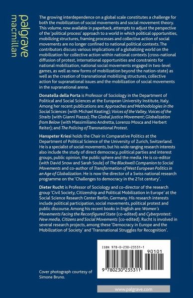 Analyzing a broad range of movements, this volume, now available in paperback, reflects on the many challenges that globalization presents for transnational activisim. It explores how international government organizations might offer political opportunities and constraints for social movements, addressing both domestic and global problems.The growing interdependence on a global scale which characterizes the human condition at the turn of the century constitutes a challenge for both the mobilization of social movements and social movement theory. The present volume makes an attempt to adjust the perspective of the political process approach to a world in which political opportunities, mobilizing structures, framing processes and collective action of social movements are no longer confined to national political contexts.