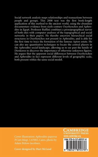 Social network analysis maps relationships and transactions between people and groups. This text was the first book-length application of this method to the ancient world, using the abundant documentary evidence from sixth-century Oxyrhynchos and Aphrodito in Egypt. Professor Ruffini combines a prosopographical survey of both sites with computer analyses of the topographical and social networks in their papyri. He thereby uncovers hierarchical social structures in Oxyrhynchos not present in Aphrodito, and is able for the first time to trace the formation of the famous Apion estate. He can also use quantitative techniques to locate the central players in the Aphrodito social landscape, allowing us to see past the family of Dioskoros to discover the importance of otherwise unknown figures. He argues that the apparent social differences between Oxyrhynchos and Aphrodito in fact represent different levels of geographic scale, both present within the same social model.