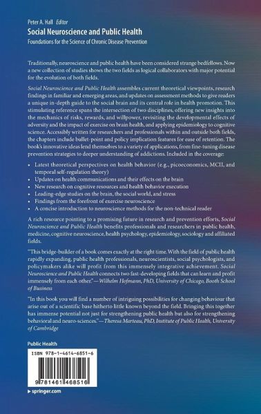 "This bridge-builder of a book comes exactly at the right time. With the field of public health rapidly expanding, public health professionals, neuroscientists, social psychologists, and policymakers alike will profit from this immensely integrative achievement. Social Neuroscience and Public Health connects two fast-developing fields that can learn and profit immensely from each other." - Wilhelm Hofmann, Ph.D., University of Chicago, Booth School of Business "In this book you will find a number of intriguing possibilities for changing behaviour that arise out of a scientific base hitherto little known beyond the field. Bringing this together has immense potential not just for strengthening public health but also for strengthening behavioral and neuro-sciences." -Theresa Marteau, Institute of Public Health, University of Cambridge