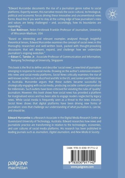 This book is the first to define and describe 'social news', a new kind of journalism emerging in response to social media. Drawing on the author's extensive research into news and social media platforms, Social News critically examines the rise of well-known outlets such as BuzzFeed and Mic in the US, and Junkee and Pedestrian in Australia. Hurcombe argues that these outlets became successful by strategically engaging with social media, producing sociable content personalised for millennials. Such outlets have been criticised for violating the rules of 'quality' journalism. However, this book shows how social news has provided a platform for marginalised voices and has been able to engage readers neglected by legacy news. While social media is frequently seen as a threat to the news industry, Social News shows that digital platforms have been driving new forms of journalism: ones thatchallenge our understanding of what journalism is, can be, and should be.