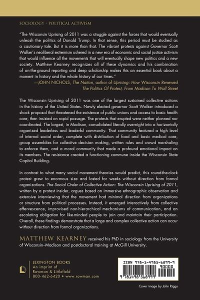 The Wisconsin Uprising of 2011 was one of the largest sustained collective actions in the history of the United States. Newly-elected Governor Scott Walker introduced a shock proposal that threatened the existence of public unions and access to basic health care, then insisted on rapid passage. The protests that erupted were neither planned nor coordinated. The largest, in Madison, consolidated literally overnight into a horizontally organized leaderless and leaderful community. That community featured a high level of internal social order, complete with distribution of food and basic medical care, group assemblies for collective decision making, written rules and crowd marshaling to enforce them, and a moral community that made a profound emotional impact on its members. The resistance created a functioning commune inside the Wisconsin State Capitol Building. In contrast to what many social movement theories would predict, this round-the-clock protest grew to enormous size and lasted for weeks without direction from formal organizations. This book, written by a protest insider, argues based on immersive ethnographic observation and extensive interviewing that the movement had minimal direction from organizations or structure from political processes. Instead, it emerged interactively from collective effervescence, improvised non-hierarchical mechanisms of communication, and an escalating obligation for like-minded people to join and maintain their participation. Overall, the findings demonstrate that a large and complex collective action can occur without direction from formal organizations.