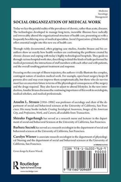 Today we face the painful reality of the prevalence of chronic, rather than acute, diseases. The technologies developed to manager long-term, incurable illnesses have radically and irrevocably altered the organizational structure of health care, presenting us with a frequently bewildering array of medical specialties. Social Organization of Medical Work offers essential insight into this new era of health care.Through richly documented, often gripping case studies, Anselm Strauss and his co-authors show us exactly how health workers are confronting the problems created by chronic disease and coping with today's highly technologized hospitals. They guide us through the various hospital work sites, describing in detail the kinds of tasks performed by medical personnel, the interactions of staff members with each other and with patients, and the overall resulting patient treatment and response.Focusing on the concept of illness trajectory, the authors vividly illustrate the complex,contingent nature of modern medical work. For example, open heart surgery keeps ill persons alive and may even improve them symptomatically, but those who do survive must face an uncertain future in terms of the physiological consequences of the surgery and the drugs required. They also have to adjust t altered lifestyles. In the new introduction, Anselm Strauss discusses the continuing importance of this work to sociologists, medical scholars, and medical professionals.