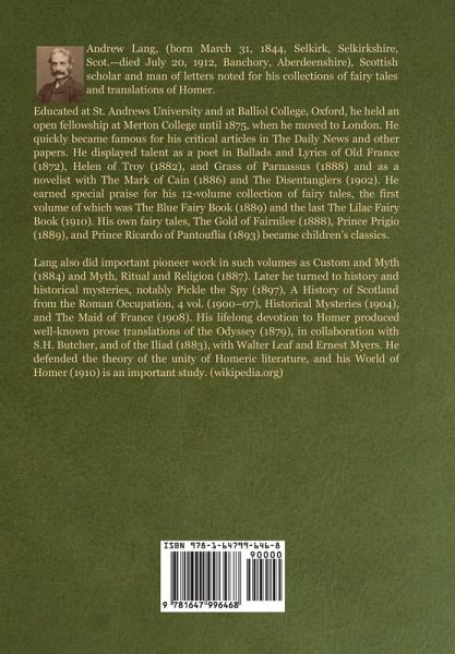 Andrew Lang, (born March 31, 1844, Selkirk, Selkirkshire, Scot.--died July 20, 1912, Banchory, Aberdeenshire), Scottish scholar and man of letters noted for his collections of fairy tales and translations of Homer. Educated at St. Andrews University and at Balliol College, Oxford, he held an open fellowship at Merton College until 1875, when he moved to London. He quickly became famous for his critical articles in The Daily News and other papers. He displayed talent as a poet in Ballads and Lyrics of Old France (1872), Helen of Troy (1882), and Grass of Parnassus (1888) and as a novelist with The Mark of Cain (1886) and The Disentanglers (1902). He earned special praise for his 12-volume collection of fairy tales, the first volume of which was The Blue Fairy Book (1889) and the last The Lilac Fairy Book (1910). His own fairy tales, The Gold of Fairnilee (1888), Prince Prigio (1889), and Prince Ricardo of Pantouflia (1893) became children's classics. Lang also did important pioneer work in such volumes as Custom and Myth (1884) and Myth, Ritual and Religion (1887). Later he turned to history and historical mysteries, notably Pickle the Spy (1897), A History of Scotland from the Roman Occupation, 4 vol. (1900-07), Historical Mysteries (1904), and The Maid of France (1908). His lifelong devotion to Homer produced well-known prose translations of the Odyssey (1879), in collaboration with S.H. Butcher, and of the Iliad (1883), with Walter Leaf and Ernest Myers. He defended the theory of the unity of Homeric literature, and his World of Homer (1910) is an important study. (wikipedia.org)