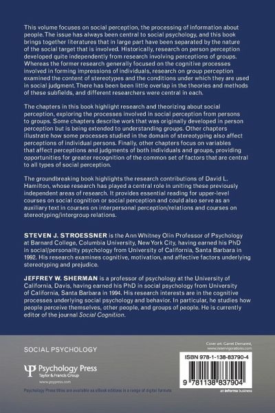 This volume focuses on social perception, the processing of information about people. This issue has always been central to social psychology, but this book brings together literatures that in large part have been separated by the nature of the social target that is involved. Historically, research on person perception developed quite independently from research involving perceptions of groups. Whereas the former research generally focused on the cognitive processes involved in forming impressions of individuals, research on group perception examined the content of stereotypes and the conditions under which they are used in social judgment. There was been little overlap in the theories and methods of these subfields, and different researchers were central in each. The chapters in this book highlight research and theorizing about social perception, exploring the processes involved in social perception from persons to groups. Some chapters describe work that was originally developed in person perception but is being extended to understanding groups. Other chapters illustrate how some processes studied in the domain of stereotyping also affect perceptions of individual persons. Finally, other chapters focus on variables that affect perceptions and judgments of both individuals and groups, proving opportunities for greater recognition of the common set of factors that are central to all types of social perception. This groundbreaking book highlights the research contributions of David L. Hamilton, whose research has played a central role in uniting these previously independent areas of research. It provides essential reading for upper-level courses on social cognition or social perception and could also serve as an auxiliary text in courses on interpersonal perception/relations and courses on stereotyping/intergroup relations.