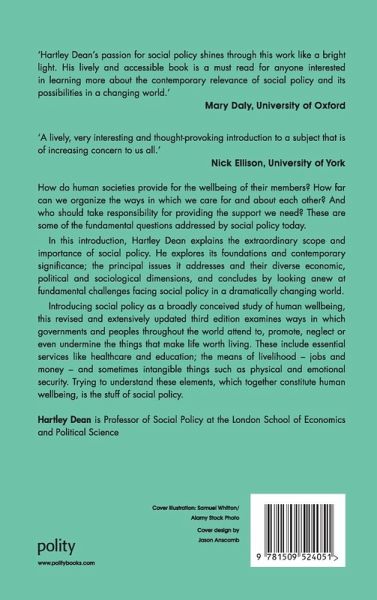 In this introduction, Hartley Dean explains the extraordinary scope and importance of social policy. He explores its foundations and contemporary significance; the principal issues it addresses and their diverse economic, political and sociological dimensions, and concludes by looking anew at fundamental challenges facing social policy in a dramatically changing world.