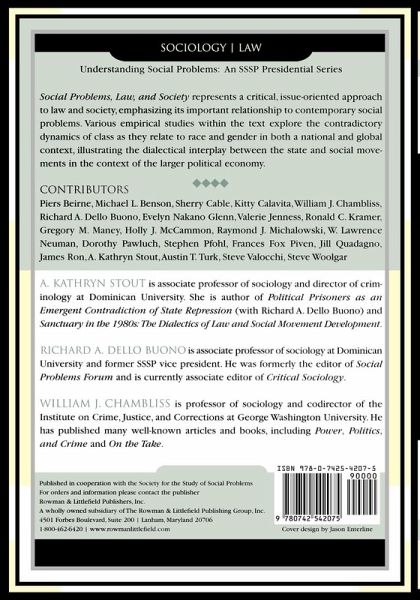William J. Chambliss is professor of sociology and codirector of the Institute on Crime, Justice, and Corrections at George Washington University. He is a pioneer in the field of critical criminology and former president of the Society for the Study of Social Problems (SSSP) and the American Society of Criminology (ASC). Chambliss has published many well-known articles and books, including Power, Politics and Crime and On the Take. Richard A. Dello Buono is associate professor of sociology at Dominican University and former SSSP vice-president. He was visiting professor of political studies and international relations at the National University of Colombia in Bogota, Fullbright Professor at the University of Panama, and invited Graduate Studies Professor at both the University of Havana, Cuba, and at the Autonomous University of Zacatecas, Mexico. Dello Buono was formerly the editor of Social Problems Forum and is currently an associate editor of Critical Sociology. A. Kathryn Stout is associate professor of sociology and director of criminology at Dominican University. She is active in the Society for the Study of Social Problems, the American Society of Criminology, and various scholar-activist and social justice organizations. Specializing on the intersection of law and social movements, she is author of "Political Prisoners as an Emergent Contradiction of State Repression" (with R. A. Dello Buono) and Sanctuary in the 1980s: the Dialectics of Law and Social Movement Development.