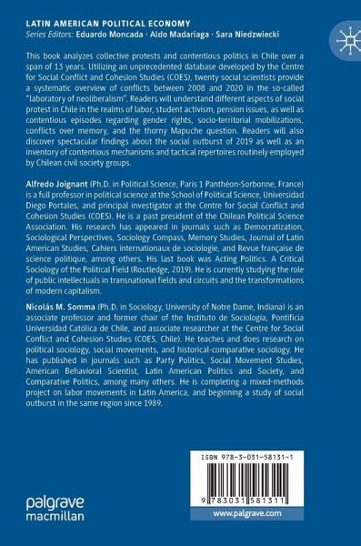 This book analyzes collective protests and contentious politics in Chile over a span of 13 years. Utilizing an unprecedented database developed by the Centre for Social Conflict and Cohesion Studies (COES), twenty social scientists provide a systematic overview of conflicts between 2008 and 2020 in the so-called "laboratory of neoliberalism". Readers will understand different aspects of social protest in Chile in the realms of labor, student activism, pension issues, as well as contentious episodes regarding gender rights, socio-territorial mobilizations, conflicts over memory, and the thorny Mapuche question. Readers will also discover spectacular findings about the popular rebellion of 2019 as well as an inventory of contentious mechanisms and tactical repertoires routinely employed by Chilean civil society groups.