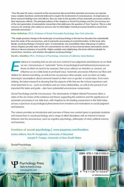 Evidence is mounting that we are not as in control of our judgments and behavior as we think we are. Unconscious or 'automatic' forms of psychological and behavioral processes are those of which we tend to be unaware, that occur without our intention or consent, yet influence us on a daily basis in profound ways. Automatic processes influence our likes and dislikes for almost everything, as well as how we perceive other people, such as when we make stereotypic assumptions about someone based on their race or gender or social class. Even more strikingly, the latest research is showing that the aspects of life that are the richest experience and most important to us - such as emotions and our close relationships, as well as the pursuit of our important life tasks and goals - also have substantial unconscious components. Social Psychology and the Unconscious: The Automaticity of Higher Mental Processes offers a state-of-the-art review of the evidence and theory supporting the existence and the significance of automatic processes in our daily lives, with chapters by the leading researchers in this field today, across a spectrum of psychological phenomena from emotions and motivations to social judgment and behavior. The volume provides an introduction and overview of these now central topics to graduate students and researchers in social psychology and a range of allied disciplines with an interest in human behavior and the unconscious, such as cognitive psychology, philosophy of mind, political science, and business.