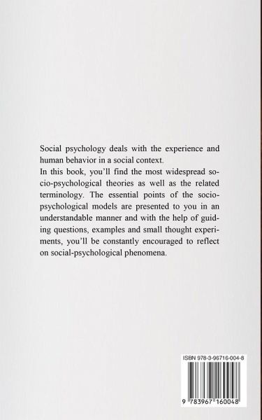 Social psychology for beginners: How our thoughts and feelings influence our behavior in social interactions Getting to know the 4 big areas of social psychology Are you interested in social psychology? Do you want to know, what influences our perception and inner experience? Do you know, how we behave in and towards other groups? Find out more about the most important models of social psychology "Psychology concerns itself in general with the experience and behavior of humans. Social psychology concerns itself with the experiences and behavior of people in social situations. This short introduction into social psychology is meant to provide you with a rough overview of the topics that social psychology deals with concretely. The aim is to bring the most important areas of research and application closer to you. For this you will be introduced to the most diverse notions of common theories from all kinds of areas. Essential elements of chosen social psychological models will be presented to you. With the help of guiding questions, examples and small thought experiments you will be invited, to think about social psychological phenomena on your own." In this helpful guide you can learn... ... with whichResearch questionssocial psychology concerns itself ... which scientific theoreticalbasic concepts are relevant in the context of social psychology ... intrapersonal processes: why we for instance find certain people attractive and others not ... interpersonal processes: what really constitutes interpersonal relationships ... intragroup processes: our characteristic behavior in ... intergroup processes: why amongst other things conflicts arise between groups and how to reduce the appearance of these ... and so much more! Secure your chance today and find out, how we perceive things, think and behave in a social context