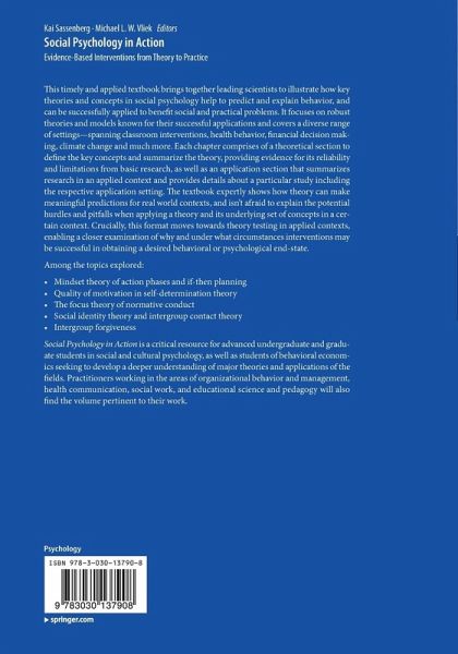 This timely and applied textbook brings together leading scientists to illustrate how key theories and concepts in social psychology help to predict and explain behavior, and can be successfully applied to benefit social and practical problems. It focuses on robust theories and models known for their successful applications and covers a diverse range of settings-spanning classroom interventions, health behavior, financial decision making, climate change and much more. Each chapter comprises of a theoretical section to define the key concepts and summarize the theory, providing evidence for its reliability and limitations from basic research, as well as an application section that summarizes research in an applied context and provides details about a particular study including the respective application setting. The textbook expertly shows how theory can make meaningful predictions for real world contexts, and isn't afraid to explain the potential hurdles and pitfalls when applying atheory and its underlying set of concepts in a certain context. Crucially, this format moves towards theory testing in applied contexts, enabling a closer examination of why and under what circumstances interventions may be successful in obtaining a desired behavioral or psychological end-state.