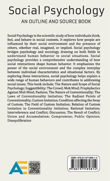 Social Psychology is the scientific study of how individuals think, feel, and behave in social contexts. It explores how people are influenced by their social environment and the presence of others, whether real, imagined, or implied. Social psychology bridges psychology and sociology, drawing on both fields to understand human behavior in social situations. Social psychology provides a comprehensive understanding of how social interactions shape human behavior. It emphasizes the power of the social environment and the complex interplay between individual characteristics and situational factors. By exploring these interactions, social psychology helps explain a wide range of human behaviors and contributes to addressing social issues. This book include; The Nature and Scope of Social Psychology; Suggestibility; The Crowd; Mob Mind; Prophylactics Against Mob Mind; Fashion; The Nature of Conventionality; The Laws of Conventionality Imitation; The Radiant Points of Conventionality; Custom Imitation; Condition affecting the Sway of Custom; The Field of Custom Imitation; Relation of Custom Imitation to Conventionality Imitation; Rational Imitation; Interreference and Conflict; Discussion; The Result of Conflict; Union and Accumulation; Compromise; Public Opinion; Disequilibration