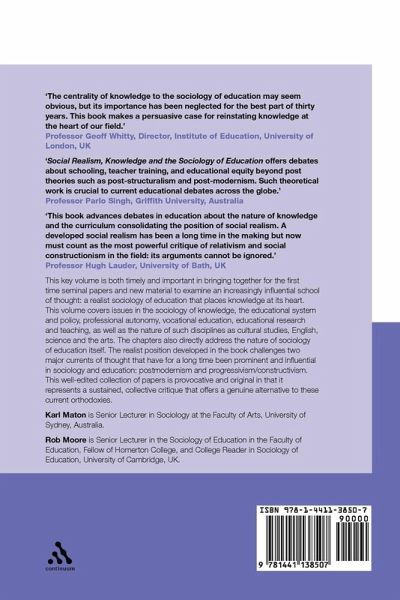 This volume covers issues in the sociology of knowledge, the educational system and policy, professional autonomy, vocational education, educational research and teaching, as well as the nature of such disciplines as cultural studies, English, science and the arts. The chapters also directly address the nature of sociology of education itself.The realist position developed in the book challenges two major currents of thought that have for a long time been prominent and influential in sociology and education: postmodernism and progressivism/constructivism. This well-edited collection of papers is provocative and original in that it represents a sustained, collective critique that offers a genuine alternative to these current orthodoxies.