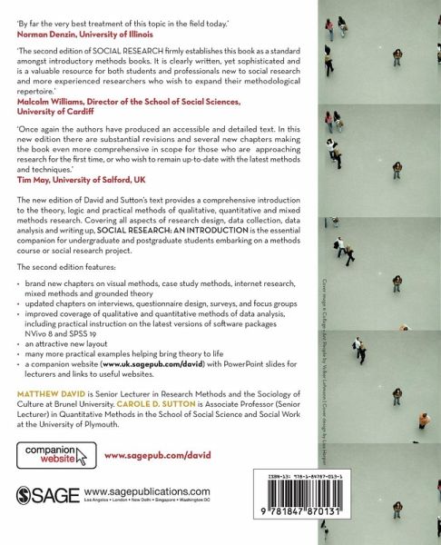 'The second edition of Social Research: An Introduction firmly establishes this book as a standard amongst introductory methods books. It is comprehensive and covers the whole range of frequently used methods. It is clearly built on solid pedagogic and conceptual foundations. David and Sutton write from the position of experienced, theoretically informed researchers with a genuine commitment to pluralism in research methods. It is clearly written, yet sophisticated and is a valuable resource for both students and professionals new to social research and more experienced researchers who wish to expand their methodological repertoire' -