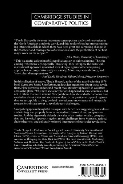 Introduction; Part I. Doing Macroscopic Social Science: 1. A critical review of Barrington Moore's social origins of dictatorship and democracy; 2. Wallerstein's world capitalist system: a theoretical and historical critique; 3. The uses of comparative history in macrohistorical research; Part II. Making Sense of the Great Revolutions: 4. Explaining social revolutions: in quest of a social-structural approach; 5. Revolutions and the world-historical development of capitalism; 6. France, Russia, and China: a structural analysis of social revolutions; Part III. A Dialogue about Culture and Ideology in Revolutions: 7. Ideologies and revolutions: reflections on the French case, byWilliam H. Sewell, Jr; 8. Cultural idioms and political ideologies in the revolutionary reconstruction of state power; Part IV. From Classical to Contemporary social revolutions: 9. What makes peasants revolutionary?; 10. Rentier state and Shi'a Islam in the Iranian revolution; 11. Explaining revolutions in the contemporary Third World; 12. Social revolutions and mass military mobilisation; Conclusion: reflections on recent scholarship about social revolutions and how to study them.