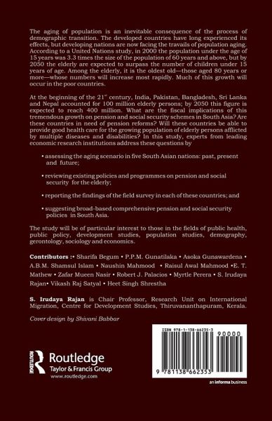 This book overviews the issue of population ageing in five countries in South Asia and projects the emerging scenarios. With a new field survey, it also documents existing policies and programs on pensions and social security, and examines their fiscal implications for the economy and society. Ageing of population is an inevitable consequence of the process of demographic transition. Being ahead, the developed regions of the world have long experienced its consequences; but the developing world is only now facing the travails of population ageing. Though the population under the age of 15 years in 2000 was estimated to be 3.3 times the size of the population of 60 years and above, the elderly are expected to surpass the number of children under 15 years by the year 2050. Among the elderly, it is the oldest old-those aged 80 years or more, whose numbers would increase most rapidly. Much of this growth would take place in the poor countries of the world. Five South Asian countries (India, Pakistan, Bangladesh, Sri Lanka and Nepal) account for 100 million elderly persons in the beginning of 21st century and it is expected to reach 400 million in 2050. What are the fiscal implications of this tremendous growth for sustaining pensions and social security schemes in South Asia? Are these countries in need of pension reforms? Would these countries be able to provide good health care for the growing population of elderly persons afflicted by multiple diseases and disability? Experts from leading economic research institutions address the issue with a new survey conducted in each country. The book, in effect: Assesses the ageing scenario in five countries in South Asia: past, present, and future; Reviews existing policies and programs on pensions and social security for the elderly; Reports the findings of a sample survey in each of these countries conducted for this work in order to assess the nature, magnitude, and adequacy of various forms of pensions and social assistance; Suggests broad-based comprehensive pension and social security policies in South Asia. .