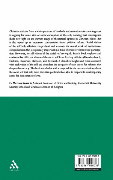 Christian ethicists from a wide spectrum of methods and commitments come together in arguing for some kind of social conception of the self, noticing that convergence sheds new light on the current range of theoretical options in Christian ethics. But it also opens up an important conversation about political reform. Social visions of the self help ethicists comprehend and evaluate the moral work of institutions--comprehension that is especially important in a time of crisis for democratic participation. But not all visions of the social self are equal. Snarr's book explores and evaluates five different visions of the social self from five key ethicists (Rauschenbusch, Niebuhr, Hauerwas, Harrison, and Townes). It identifies insights and risks associated with each vision of the self and considers the adequacy of each vision for reforms that deepen democracy. The book concludes with a proposal for six core convictions about the social self that help form Christian political ethics able to respond to contemporary needs for democratic reform.