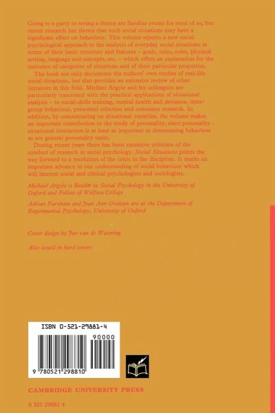 Going to a party or seeing a doctor are familiar events for most of us, but recent research has shown that such social situations may have a psychological approach to the analysis of everyday social situations terms of their basic structure and features -- goals, rules, roles, physical setting, language and concepts, etc. -- which offers an explanation for the existence of categories of situations and of their particular properties. The book not only documents the authors' own studies of real-life social situations, but also provides an extensive review of other literature in this field. Michael Argyle and his colleagues are particularly concerned with the practical applications of situational analysis -- to social-skills training, mental health and deviance, intergroup behaviour, personnel selection and consumer research. In addition, by concentrating on situational variables, the volume makes an important contribution to the study of personality, since personality -situational interaction is at least as important in determining behaviour as are general personality, traits. During recent years there has been extensive criticism of the conduct of research in social psychology. Social Situations points the way forward to a resolution of the crisis in the discipline. It marks an important advance in our understanding of social behaviour will interest social and clinical psychologists and sociologists.