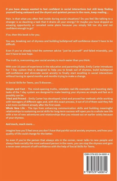 If you have always wanted to feel confident in social interactions but still keep finding yourself being awkward and the shyest and quietest person in the room, keep reading... Pain. Is that what you often feel inside during social situations? Do you feel like talking to a stranger is so daunting a task that it drains all your energy? Or maybe you have skipped an amazing opportunity or canceled some plans because you simply felt too shy and not confident enough to go? If so, then this book is for you. You see, breaking out of shyness and building bulletproof self-confidence doesn't have to be difficult. Even if you've already tried the common advice "just be yourself" and failed miserably, you don't have to lose hope. The truth is, overcoming your social anxiety is much easier than you think. With over 10 years of experience in the education and parenting fields, Emily Carter introduces her 7-Day system that is designed to help you to break out of shyness, build bulletproof self-confidence and eliminate social anxiety to finally start excelling in social interactions without having to spend months and months trying to make a change. In Social Skills for Teens, you'll discover... Simple and Fast - The mind-opening truths, relatable real-life examples and boosting daily tasks of the 7-day system are designed to make beating your shyness as simple and fast as it possibly can be. Tried and Proved - Emily Carter has developed, tried and proved her methods while working with teenagers of different ages and, with this exact process, 9 out of 10 of them said they felt a lot more confident already after the first week. Whole New Life - The tips from enhancing communication skills and building meaningful relationships to sustaining social skills for long-term success will open you to a whole new life with a ton of new adventures and relationships that you missed out on earlier solely because of your shyness. And much, much more... Imagine how you'll feel once you don't have that painful social anxiety anymore, and how your quality of life could change for the better. So even if you're the person that always sits in the corner, never talks to new people and always feels socially the most awkward person in the room, you can stop the shyness and gain a never-seen amount of self-confidence with the help of Social Skills for Teens.