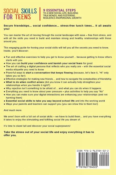 Secure friendships... build confidence... navigate social life with ease! School means 180 lunchtimes a year-180 opportunities for connection, but also for stress and uncertainty. Does lunch feel like a social battlefield? ¿Conflicting friend groups make every choice feel wrong. ¿You linger on the sidelines, afraid to start a conversation. ¿Or maybe you're in the center of everything, but it often ends in conflict. This guide is here to help. Inside, you'll discover: ¿Fun exercises to understand yourself. ¿Confidence-building techniques to overcome social fears. ¿Communication skills for effortless conversations. ¿Strategies for lasting friendships and resolving conflicts. ¿Tips for navigating peer pressure and social media. Social skills aren't something you're born with-they're something you build. With the right tools, you'll approach conversations confidently, handle rejection gracefully, and build meaningful connections. Are you ready to unlock your social superpowers? Your journey starts now!