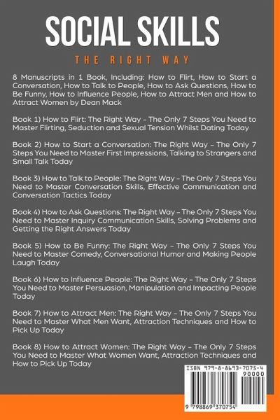 8 Manuscripts in 1 Book, Including: How to Flirt, How to Start a Conversation, How to Talk to People, How to Ask Questions, How to Be Funny, How to Influence People, How to Attract Men and How to Attract Women! Book 1) How to Flirt: The Right Way - The Only 7 Steps You Need to Master Flirting, Seduction and Sexual Tension Whilst Dating Today Book 2) How to Start a Conversation: The Right Way - The Only 7 Steps You Need to Master First Impressions, Talking to Strangers and Small Talk Today Book 3) How to Talk to People: The Right Way - The Only 7 Steps You Need to Master Conversation Skills, Effective Communication and Conversation Tactics Today Book 4) How to Ask Questions: The Right Way - The Only 7 Steps You Need to Master Inquiry Communication Skills, Solving Problems and Getting the Right Answers Today Book 5) How to Be Funny: The Right Way - The Only 7 Steps You Need to Master Comedy, Conversational Humor and Making People Laugh Today Book 6) How to Influence People: The Right Way - The Only 7 Steps You Need to Master Persuasion, Manipulation and Impacting People Today Book 7) How to Attract Men: The Right Way - The Only 7 Steps You Need to Master What Men Want, Attraction Techniques and How to Pick Up Today Book 8) How to Attract Women: The Right Way - The Only 7 Steps You Need to Master What Women Want, Attraction Techniques and How to Pick Up Today You have made an excellent decision by choosing to learn more about social skills. So, don't delay it any longer. Order "Social Skills" Now!